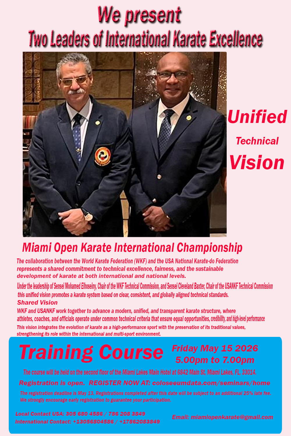 Date: 05-15-2026 Subject: International Training Course: Karate System based on Clear, Consistent, and Globally Aligned Technical Standards. Among the highest standards of competence and performance for coaches, referees, and athletes. Prices: Unified Technical $100.00, Address in Google Map