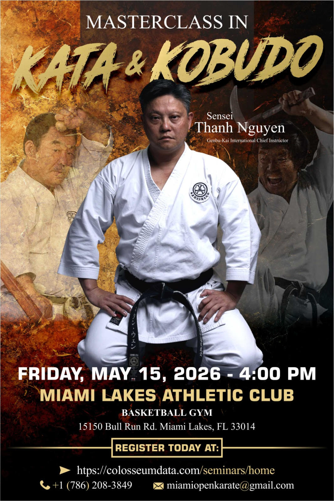Date: 05-15-2026 Subject: Traditional Bassai Kata & Kobudo Basic Work. The Master Class with the sensei continues the legacy of Master Fumio Demura. Thanks to the Genbu Kai Karate Do Community and Karate Do Alliance League Florida Prices: $50.00, Address in Google Map