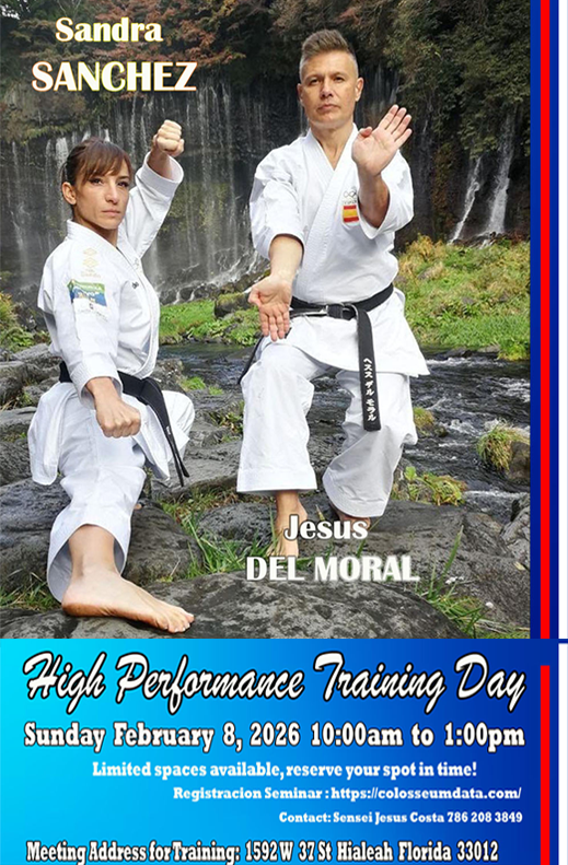Date: 02-08-2026 Subject: Elite WKF Kata training focused on technical precision, timing, and competition-ready performance, led by Jesús Del Moral and Sandra Sánchez. Prices: WKF International Elite Kata $100.00, Address in Google Map